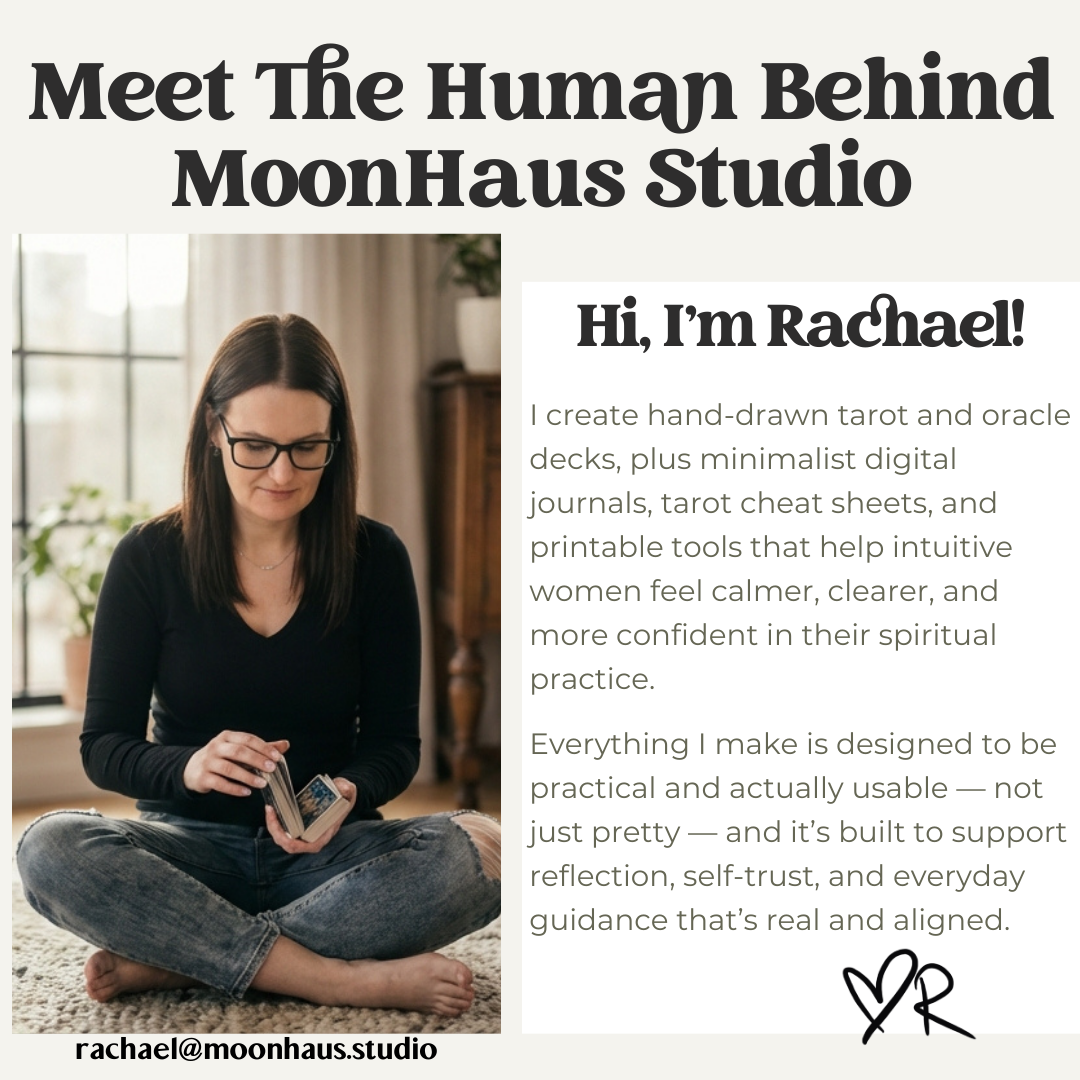 MoonHaus Studio is where I create hand-drawn tarot decks and modern spiritual tools for women who trust themselves and don’t need the noise.