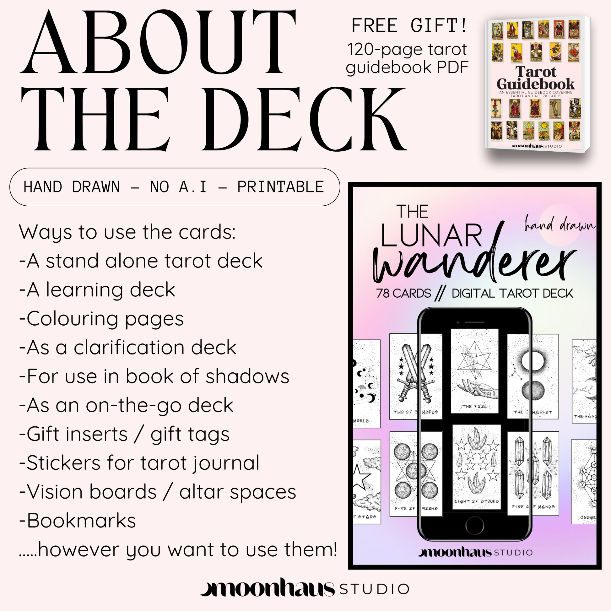 Printable & Digital Tarot Card Deck: The Lunar Wanderer, Indie, Hand Drawn Tarot Art | Free at Checkout
