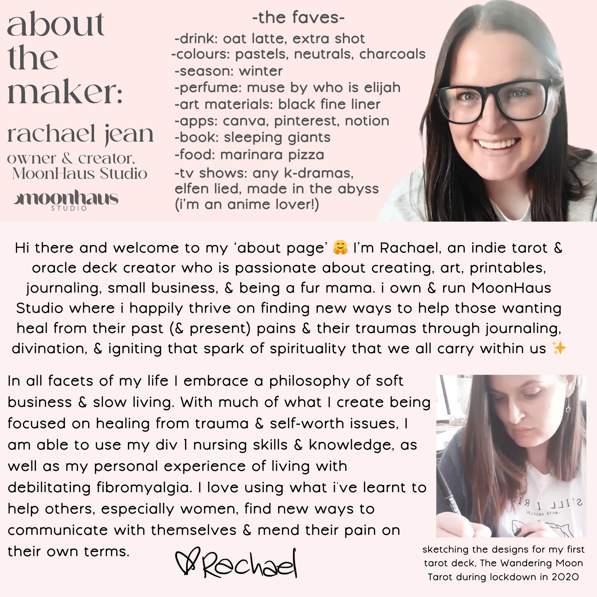Important note: due to illegal bootleg copies of The Wandering Moon Tarot being sold online and my inability as a small business to compete with those purchasing said illegal copies, this deck is now retired. This means that it will not be printed again. All decks of The Wandering Moon Tarot purchased from August ‘23 onwards are from the last print run. When the number of decks remaining becomes critically low, I will let people know so on @moonhaus.studio on Instagram and via my e-letter, sign up here -rach xoxo