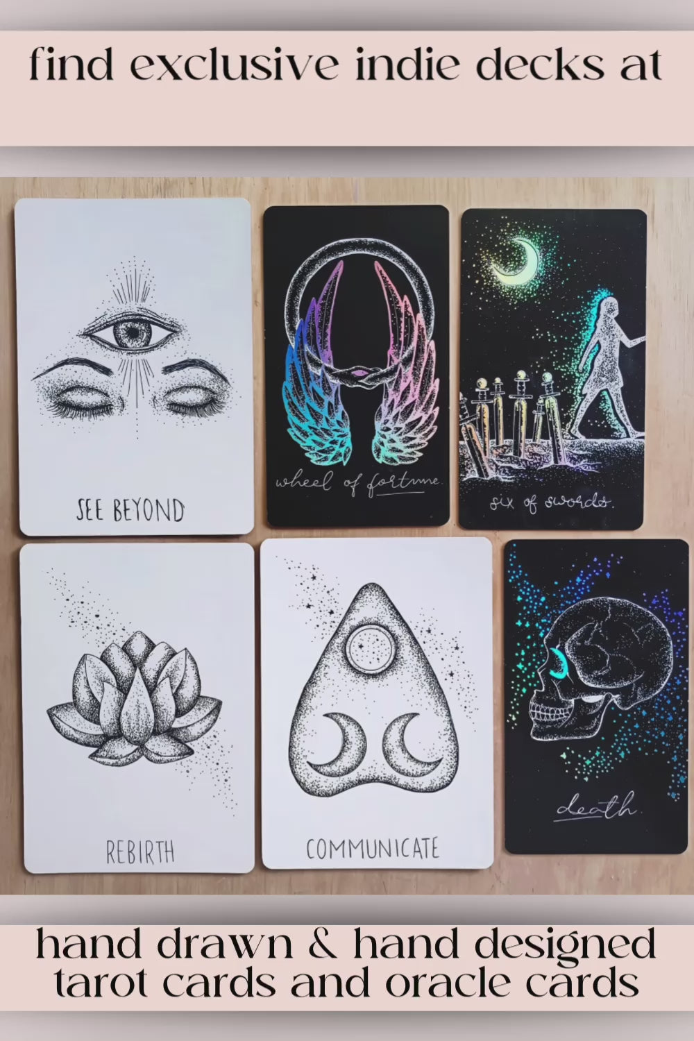 reflections, insights, messages & more await with this exclusive & unique set of two aesthetic indie decks, featuring hand-illustrated artwork & holographic details throughout.