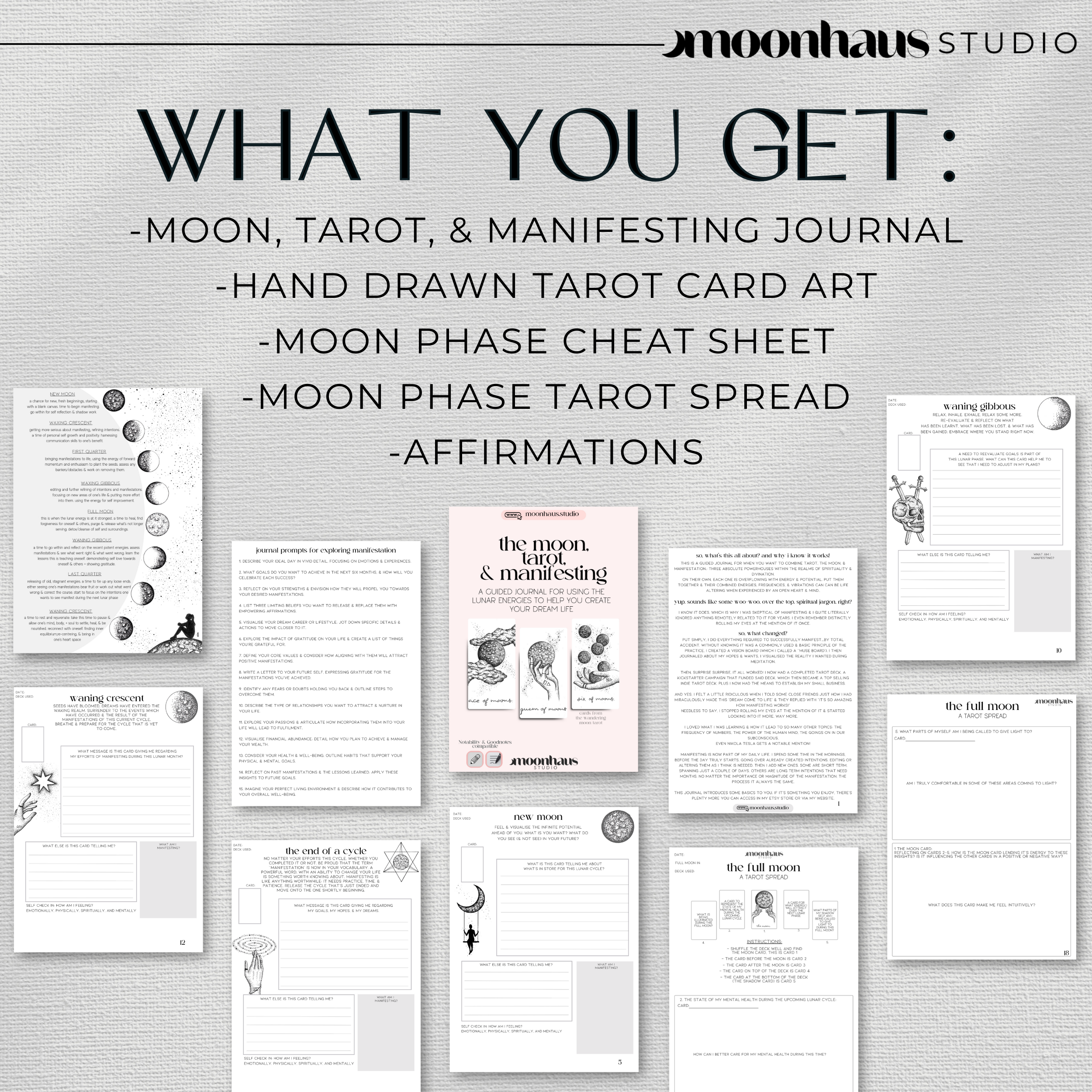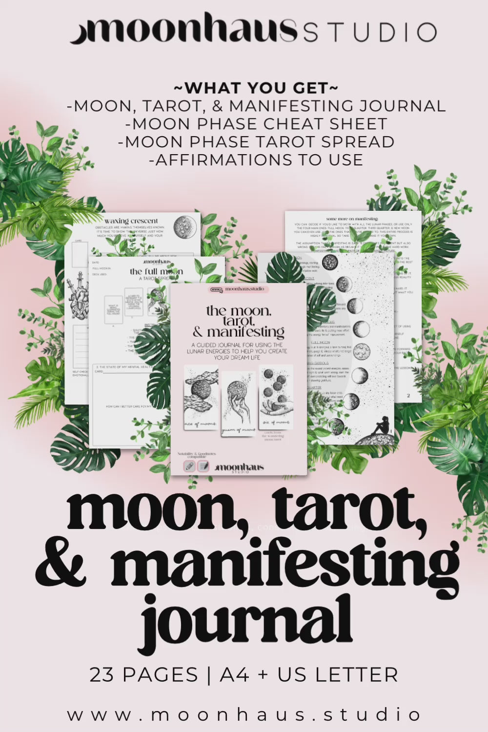 🌙unlock the power of the moon & tarot with this original 23-page journal booklet! find out just how easy yet powerful it can be to seamlessly blending the light & shadow of lunar cycles, with the energy & mysticism of tarot, to assist & guide you on your very own transformative manifestation journey. allow this mixture of divination, planetary energies, & the law of attraction, all in the one convenient companion, to guide you on your path to making your hopes & dreams into your reality.