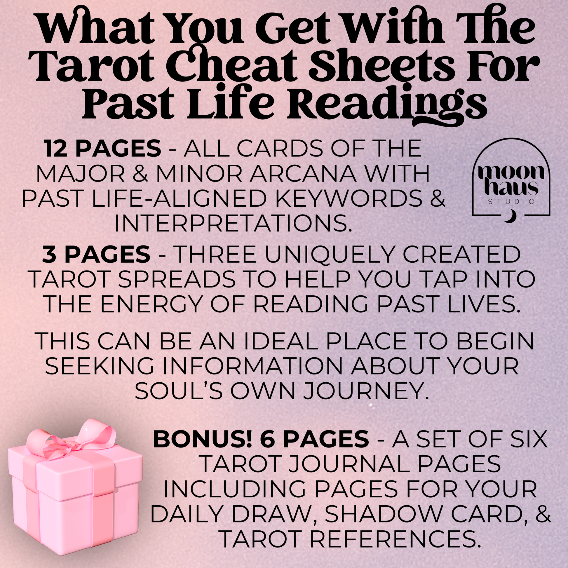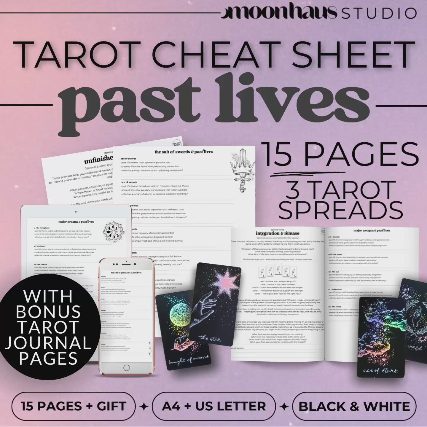 This 15-page Tarot & Past Lives cheat sheet set is designed to help you explore past life symbolism, karmic patterns, and soul history using tarot in a grounded, practical way.