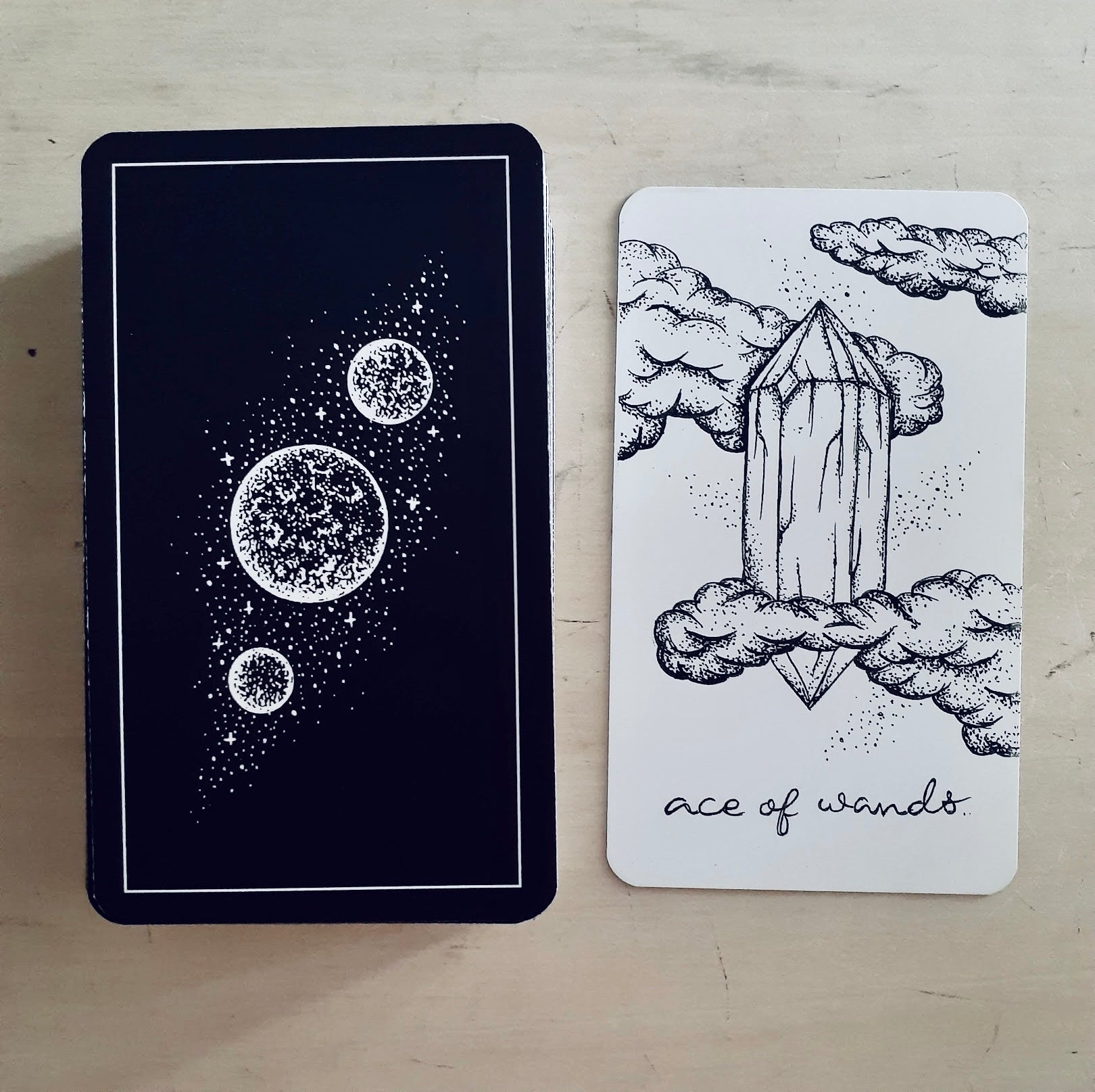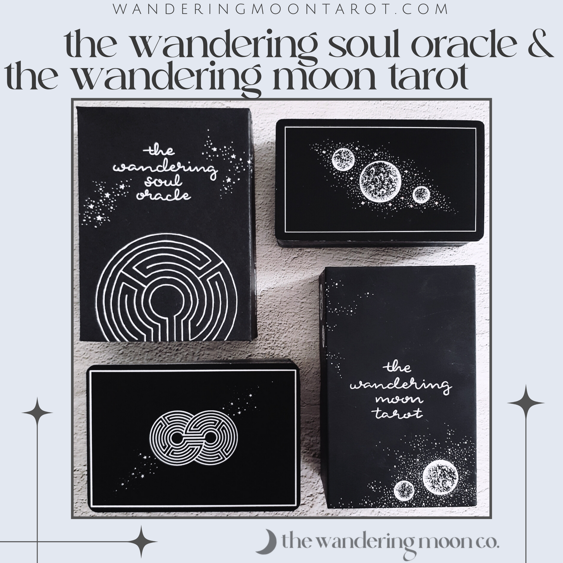 🌟an aesthetic tarot deck & oracle deck set, two unique minimalist indie decks together from MoonHaus Studio: The Wandering Moon Tarot and The Wandering Soul Oracle are luxe divination tools with their own in depth guidebooks and top quality top and bottom lid boxes. these decks can be used together or separately, the same aesthetic flows through them both, for tarot beginners and seasoned readers alike 🖤🌠