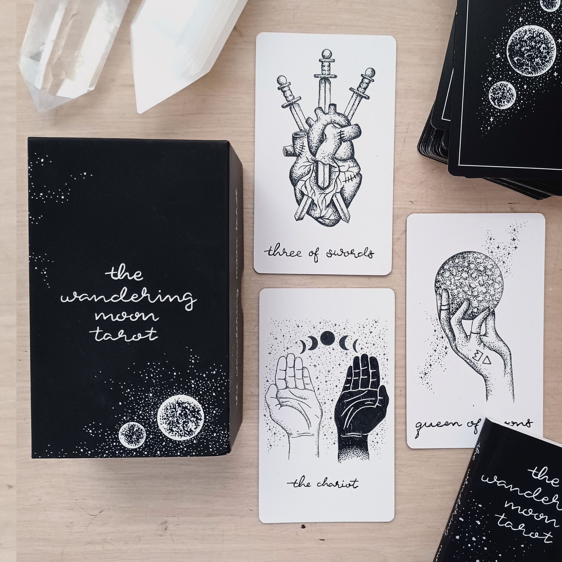 Important note: due to illegal bootleg copies of The Wandering Moon Tarot being sold online and my inability as a small business to compete with those purchasing said illegal copies, this deck is now retired. This means that it will not be printed again. All decks of MoonHaus Studio purchased from August ‘23 onwards are from the last print run. When the number of decks remaining becomes critically low, I will let people know so on @moonhaus.studio on Instagram and via my e-letter (sign up here). -rach xoxo