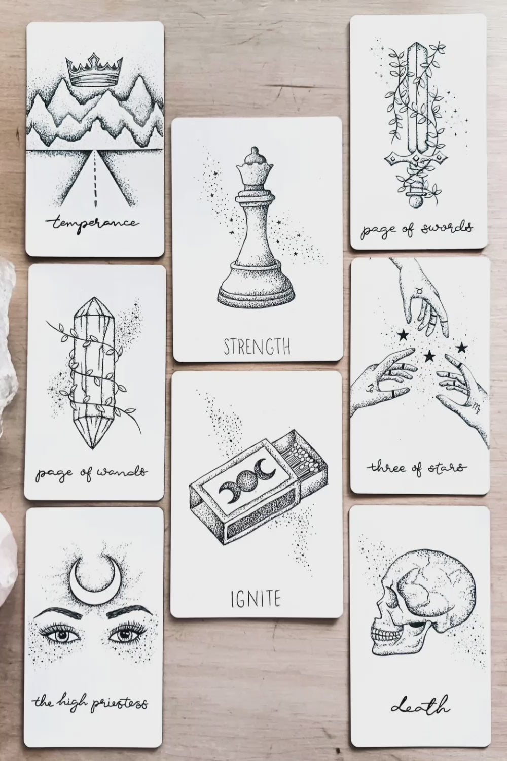 ✨ Holographic Foiling: Our tarot & oracle cards are not just a tool, but a work of art. With holographic foiling, each card comes to life in the light, adding a gorgeous depth & aesthetic to the black and white, hand drawn illustrations.
