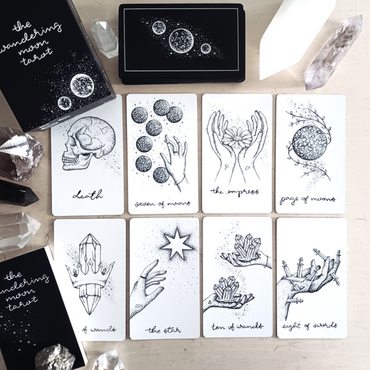 A sad note: The Wandering Moon Tarot is now a retired, out of print deck. Authentic copies are still available for purchase. All other decks will remain as per usual. -Rachael x